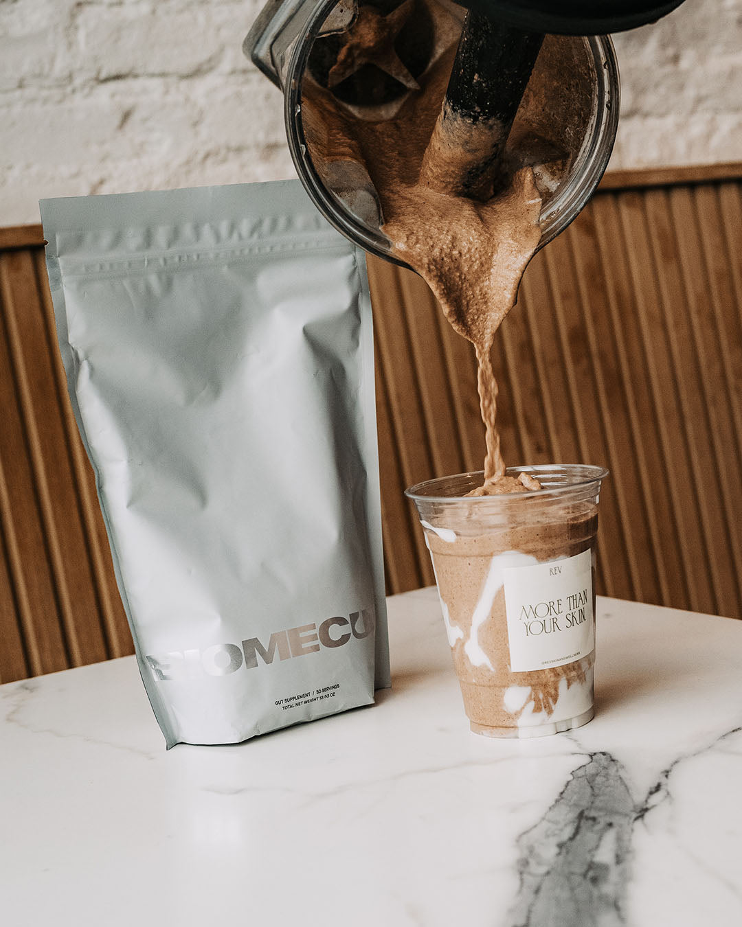 It’s blended with house-made almond cashew milk, coconut probiotic yogurt, banana, cinnamon, maple syrup, bone broth vanilla protein, almond butter, dates, vanilla, and a scoop of BiomeCult’s prebiotic gut supplement for that skin-loving, inside-out glow. And if you want to do it the REV way, swap in cauliflower rice for extra volume with fewer sugars.
